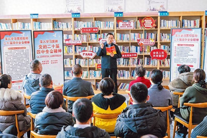 为推动党的二十届四中全会精神落地生根,各地纷纷开展多层次、全方位、立体化的宣讲活动。图为2025年11月25日,江苏省宿迁经济技术开发区黄河街道道口社区书房里,宿迁市“向阳花”宣讲团成员正在宣讲全会精神。 人民图片 徐江海/摄
